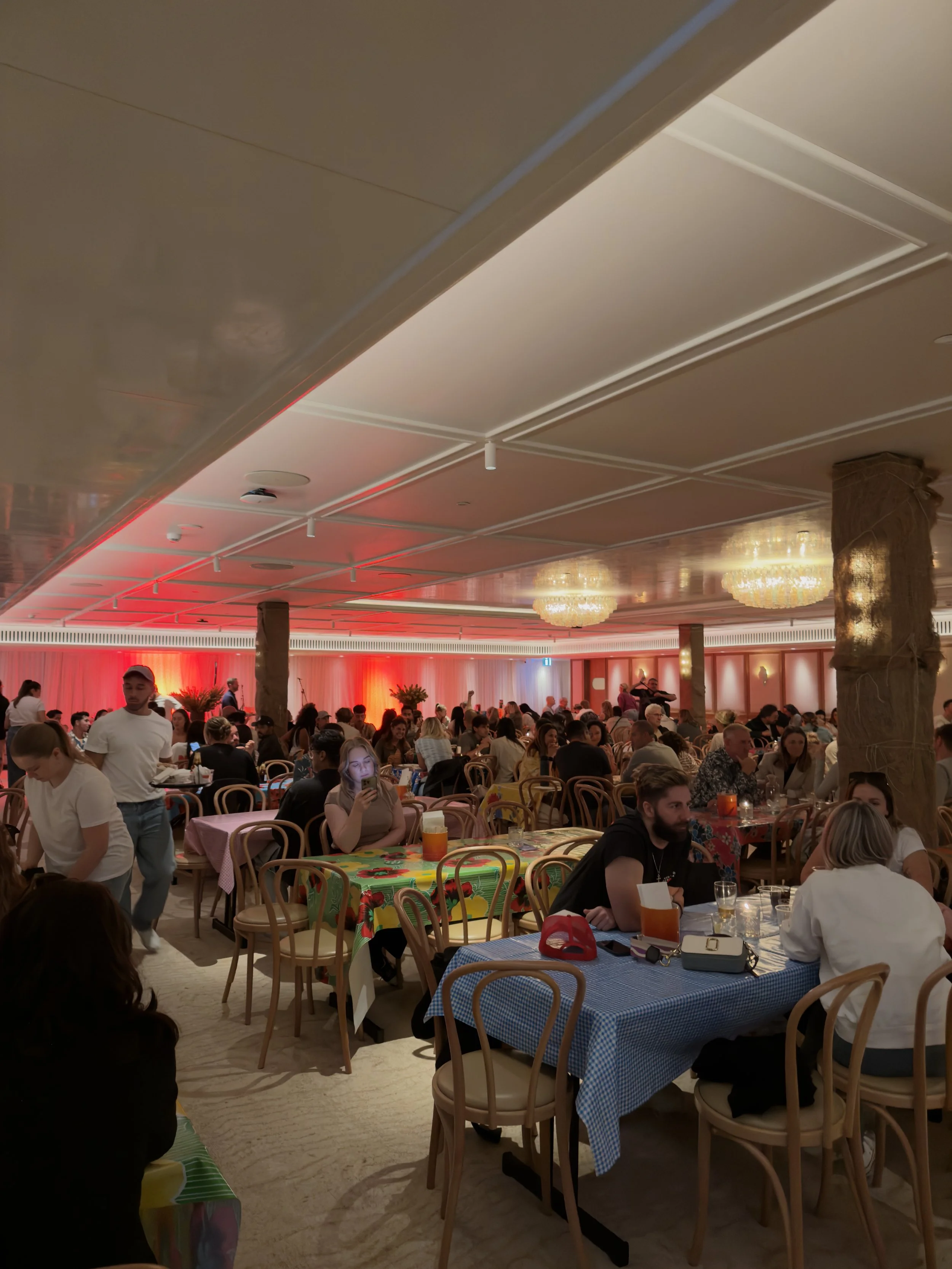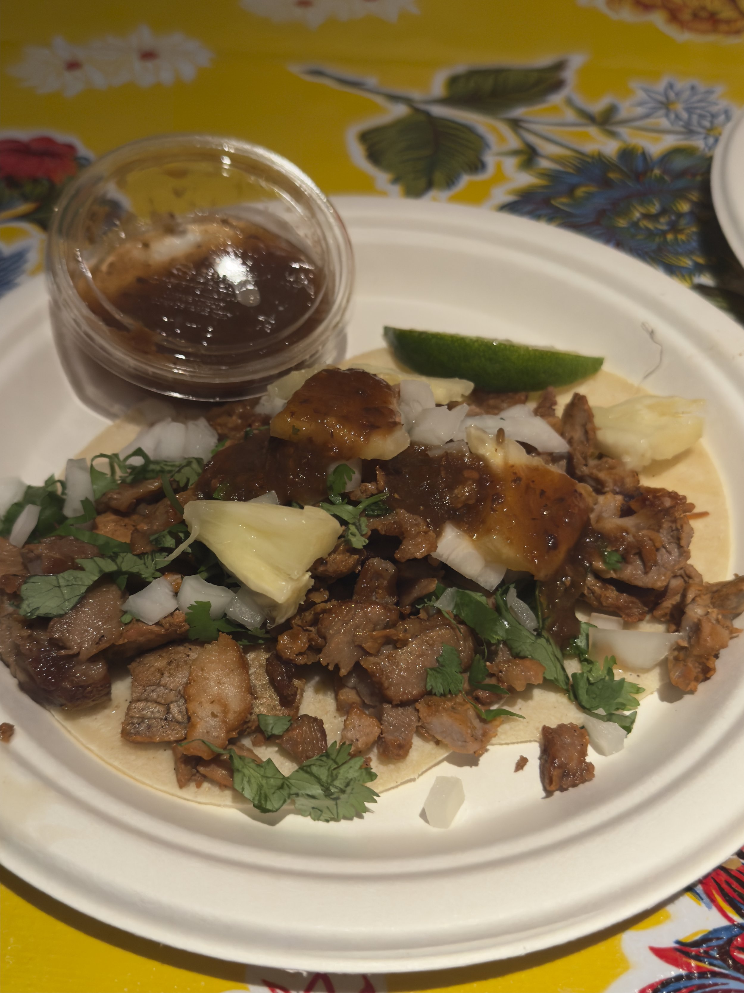 I managed to get myself down there on the final Saturday night of their stint. Rookie error on my behalf. Shoulders grazed against mine constantly as we shoved our way through crowds. A lengthy line snaked around the corn stall and I listened with envy to the slurps of the soupy esquites I was not going to wait for. Live music was escaping from the jam-packed jetty but second-hand claustrophobia prevented me from even attempting to enter. So we found the next best thing, the newly refurbished and very formal events space resembling a carpeted school cafeteria during multicultural week, blasting Bad Bunny over the speakers. Plastic tablecloths stamped with bright flowers were splayed over each table, dressed simply with a tin of wooden cutlery and a handful of hungry diners.